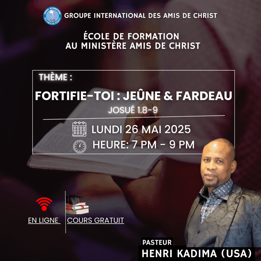- Ce module explore la puissance spirituelle du jeûne biblique et le sens profond de « porter un fardeau » selon Dieu. En s’appuyant sur Josué 1:8, les participants apprendront à se discipliner dans la prière et le jeûne pour discerner, accepter et accomplir les fardeaux que Dieu confie — qu’ils soient personnels, intercessionnels ou missionnaires. Le but : une foi active, enracinée dans l’obéissance et la méditation de la Parole, qui transforme le croyant en un instrument puissant pour le Royaume.